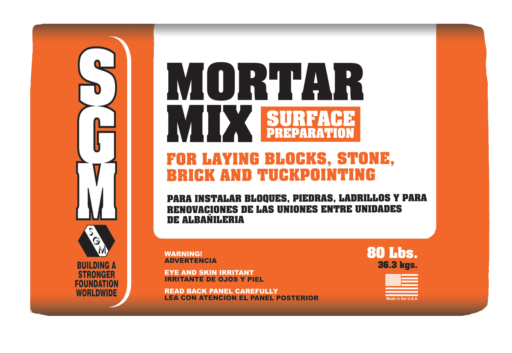 (Pre-Blended Mortar Type S)SGM Mortar Mix Surface Preparation is a computerized blend of special high strength masonry cement, proprietary admixtures, and sand developed to produce a consistent quality mix from batch to batch eliminating costly job-site mixing of these components. SGM Mortar Mix Surface Preparation is conveniently packaged in sixty (60) pound (27.2 kg) and eighty (80) pound (36.3 kg) four-ply polyethylene lined bags and custom palletized for easy handling and movement on the job-site. Use for laying block, stone, brick, tuck-pointing, scratch, brown, or finish coat stucco. SGM Mortar Mix Surface Preparation is ideally suited for use as a substrate for hard surface flooring both interior and exterior applications.