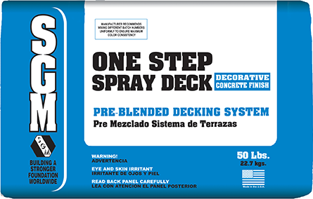 SGM One-Step Spray Deck System is a pre-blended decking system that incorporates dry resin technology which eliminates the need for liquid additives. Simply add water and spray or apply by trowel over new or existing concrete surfaces. Available in twelve (12) colors, this product is slip-resistant and comfortable under the foot. Southcrete™ One-Step Spray Deck System is a perfect choice for pool and spa decks, walkways, entrances, and driveways in both residential and commercial applications.