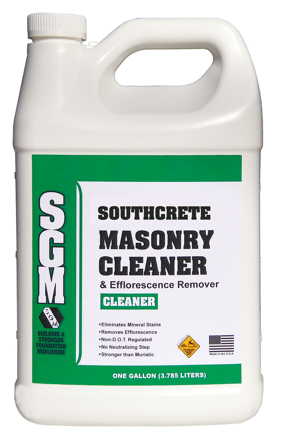 Southcrete™ Masonry Cleaner and Efflorescence Remover safely and quickly cleans a variety of cementitious substrates, such as masonry, concrete, brick pavers, river rock, architectural concrete, retainer walls, et cetera, while dissolving all signs of efflorescence. This special synthetic acid formula dissolves more calcium carbonate and efflorescence than muriatic (hydrochloric) acid-based or phosphoric acid-based cleaners. This cleaner can be used to prepare stone and masonry surfaces for clear sealers, stains, or paints, or to simply restore the original beauty and natural look.