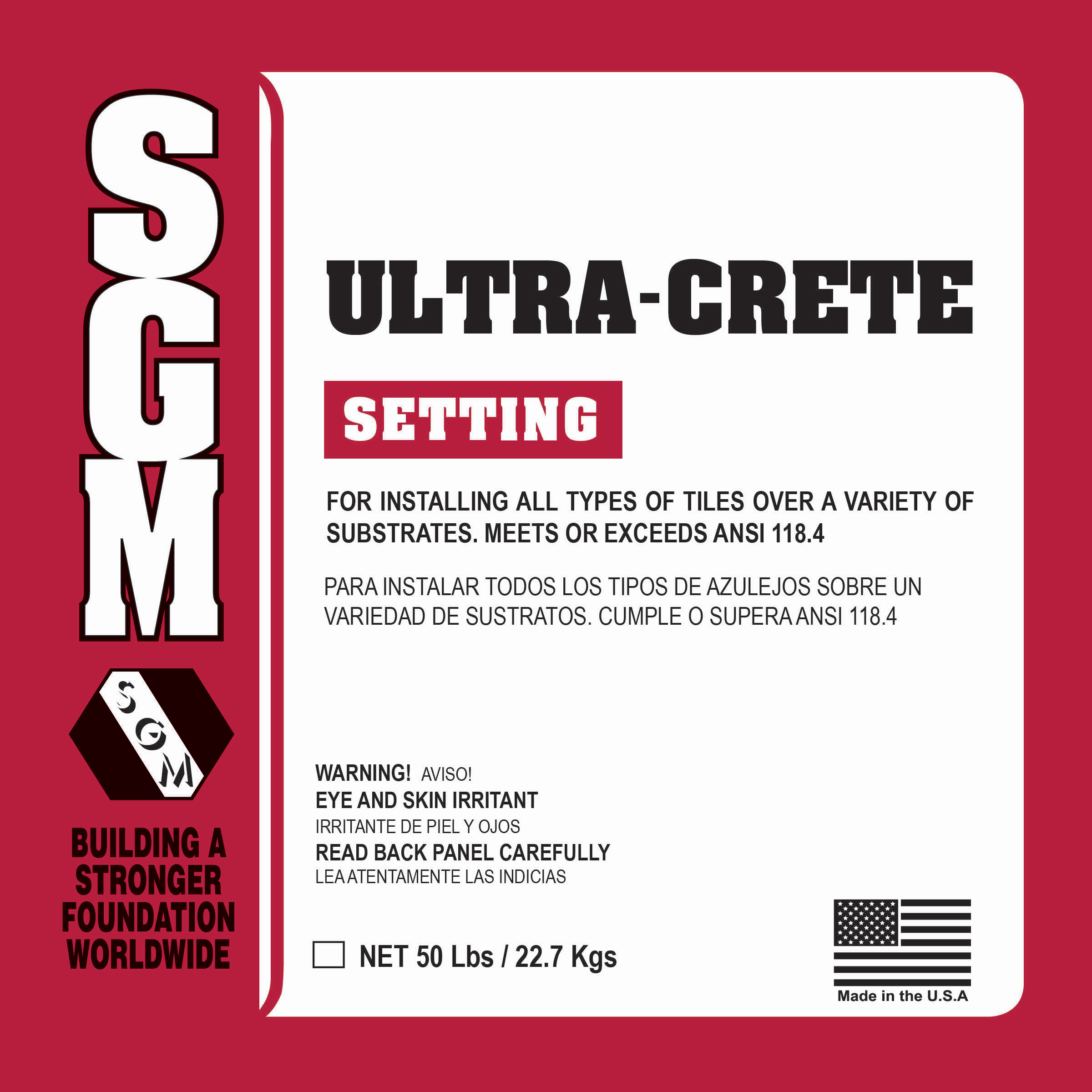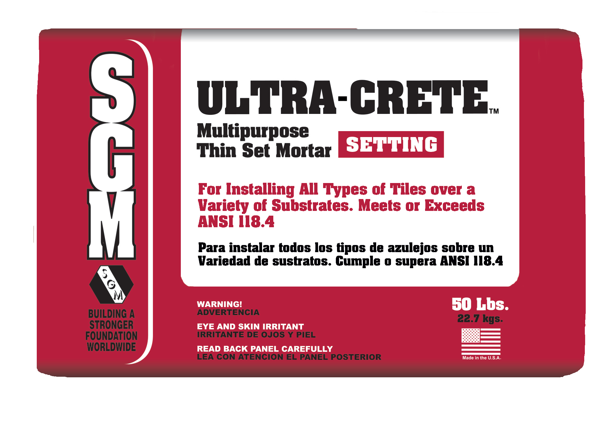(Contractor Grade Latex-Portland Cement Mortar)SGM Ultra-Crete Multi-Purpose Thin-Set Mortar is a premium Latex-Portland cement mortar formulated for the installation of ceramic, mosaic, quarry tiles, and dimension stone. Redispersible powder additives are used to improve adhesion, provide greater bond strength, and resistance to impact and shock.
